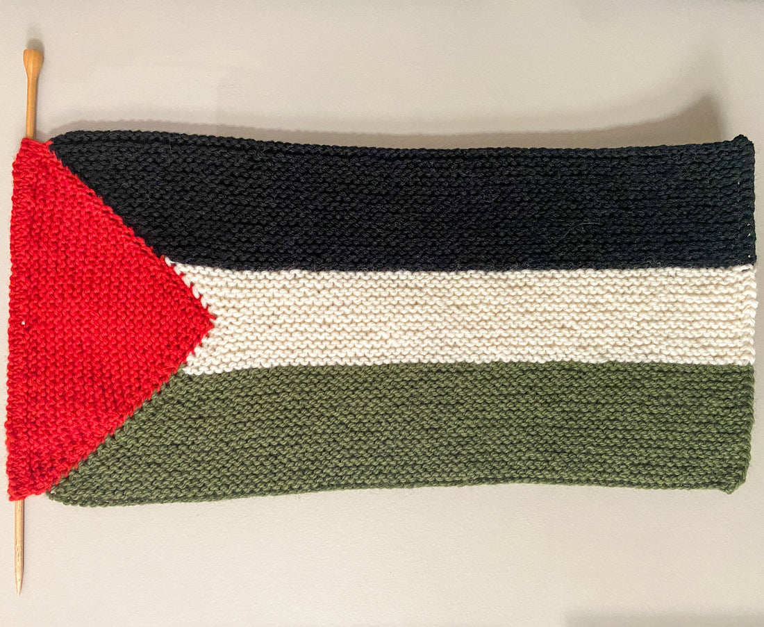 Using red yarn, sew the stripes to the red triangle with whip stitch. Weave in ends and block. Fold red edge over dowel rod or knitting needle and stitch down to keep it in place. Hang on a hook or use extra red yarn to create a hanger to display in windows, on walls, or on doors. Happy knitting, and Free Palestine!
